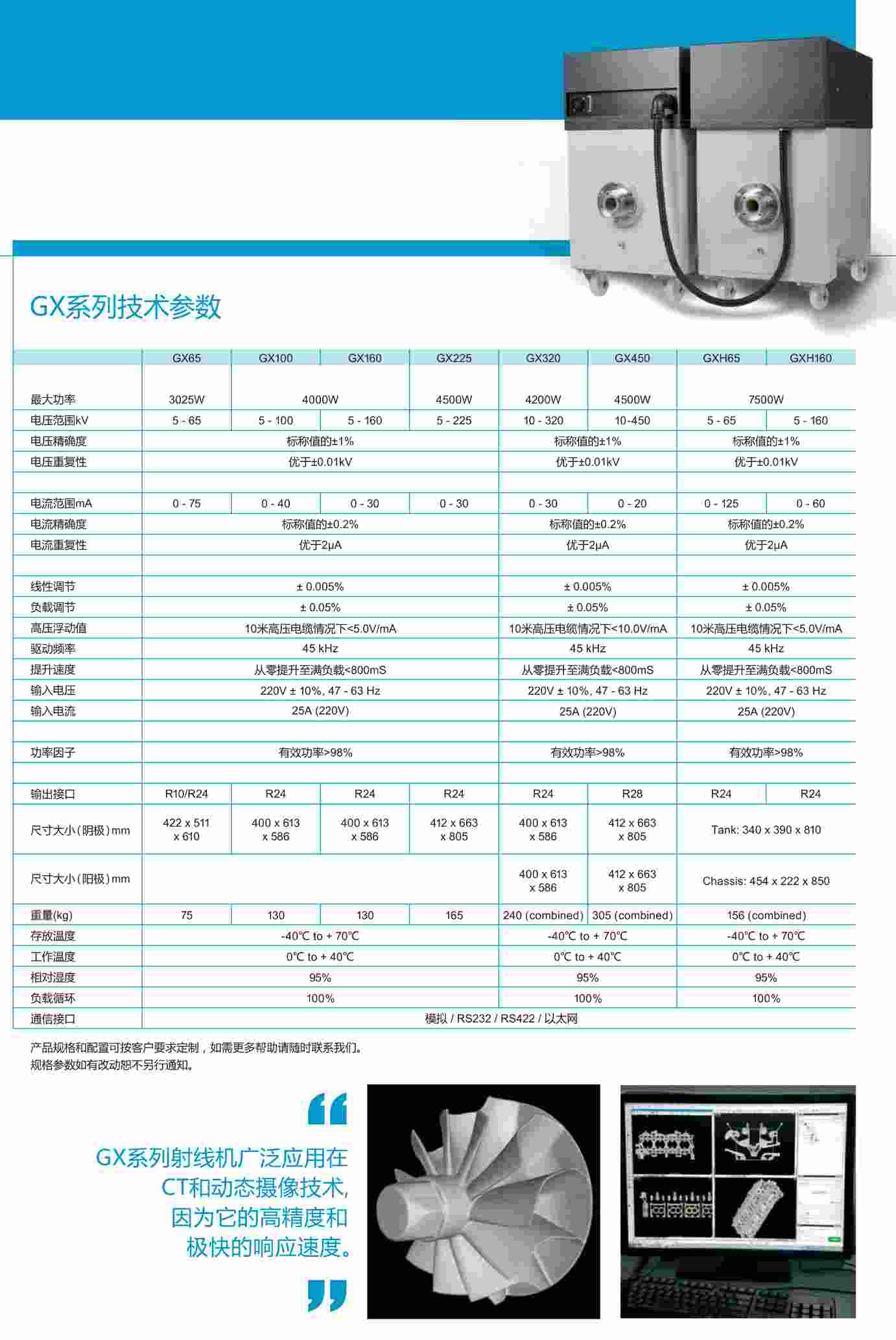 GX系列射線機可匹配全系列的X射線管,給X射線無損檢測和其他特殊應用提供了更好的選擇。GX系列管電壓提升速度快,從0到最大功率,提升時間僅為800ms,給CT和動態(tài)采集提供了理想的選擇。GX系列具有非常高的功率,可應用于各個行業(yè),無論是高密度材料還是低密度復合材料的檢測。GX系列高密度和高重復性的特點,在鋼鐵測厚和醫(yī)療行業(yè)也發(fā)揮很重要的作用。