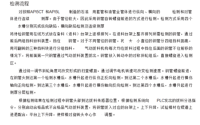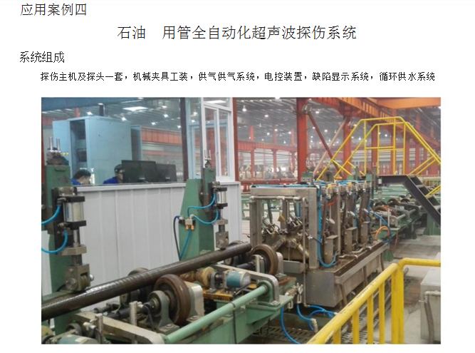 工作方式:工件旋轉(zhuǎn)式前進(jìn),探頭固定探頭位于水槽內(nèi),探傷時(shí)水禮升起,工件下方侵入水槽探頭與彼測(cè)管泊通過(guò)循環(huán)水的耦合方式掃查探傷。比較適合石油管道。
