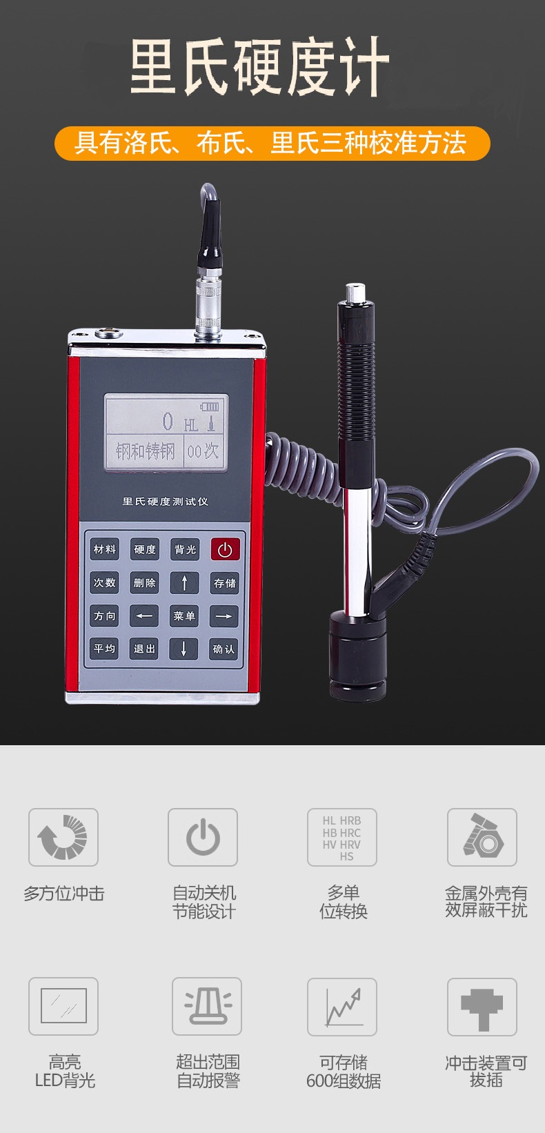 可將里氏(HL)值轉換成布氏、洛氏、維氏或肖氏硬度值,直接測量大型或重型的試件,可測已安裝的機械或組裝的部件,金屬材料倉庫的材料區(qū)分,可測大型工件的狹小空間等:體積小、重量輕、易于操作。