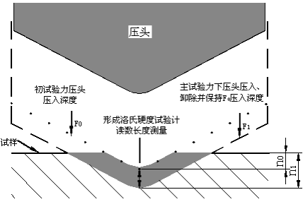 試驗開始時,試驗機壓頭放在試件上,施加初試驗力,并建立一由位移傳測量裝置測出的基準(zhǔn)點。因為初試驗力使壓頭壓入試件,所以表面的光潔或不規(guī)則不會影響試驗。接著試驗機施加主試驗力,這一較大的力,進入試樣更深,然后卸除主試驗力,同時保持初試驗力,此時,試驗機測量相對于既定的基準(zhǔn)點的凹痕深度。凹痕的直線深度是洛氏硬度數(shù)值的基礎(chǔ)。凹痕深度淺只表示材料硬度較高,凹痕深度相對深,則表示材料硬度較軟。