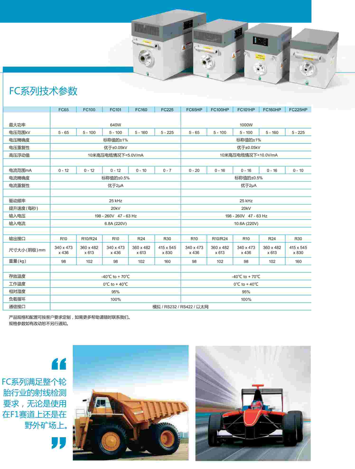 當(dāng)使用傳統(tǒng)的和高功率的X射線管時,F(xiàn)C系列射線機是理想的高壓供給系統(tǒng)。可應(yīng)用在各種X射線影像技術(shù)。包括二極管線陣列成像、數(shù)字平板成像和動態(tài)平板成像。FC系列產(chǎn)品被廣泛的應(yīng)用在輪胎檢測行業(yè),同時也應(yīng)用在食品檢測、安保檢測等一系列NDT檢測。