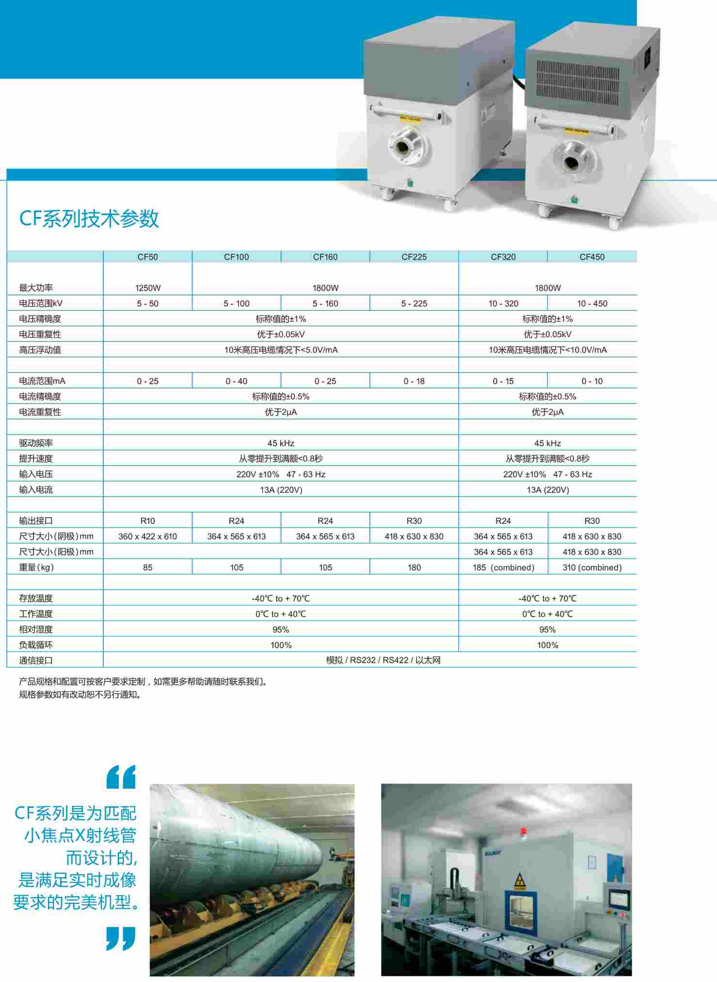 CF系列射線機(jī)的設(shè)計理念是提供性價比高的解決方案。利用45kHz的高壓工作頻率和高美特有的可變頻技術(shù),既可以滿足小焦點(diǎn)的X射線管,又滿足高輸出功率的射線管,CF系列射線機(jī)成為實(shí)用、多功能場合應(yīng)用的產(chǎn)品。廣泛應(yīng)用在NDT實(shí)時成像及各種測量和精度校準(zhǔn)系統(tǒng)上。