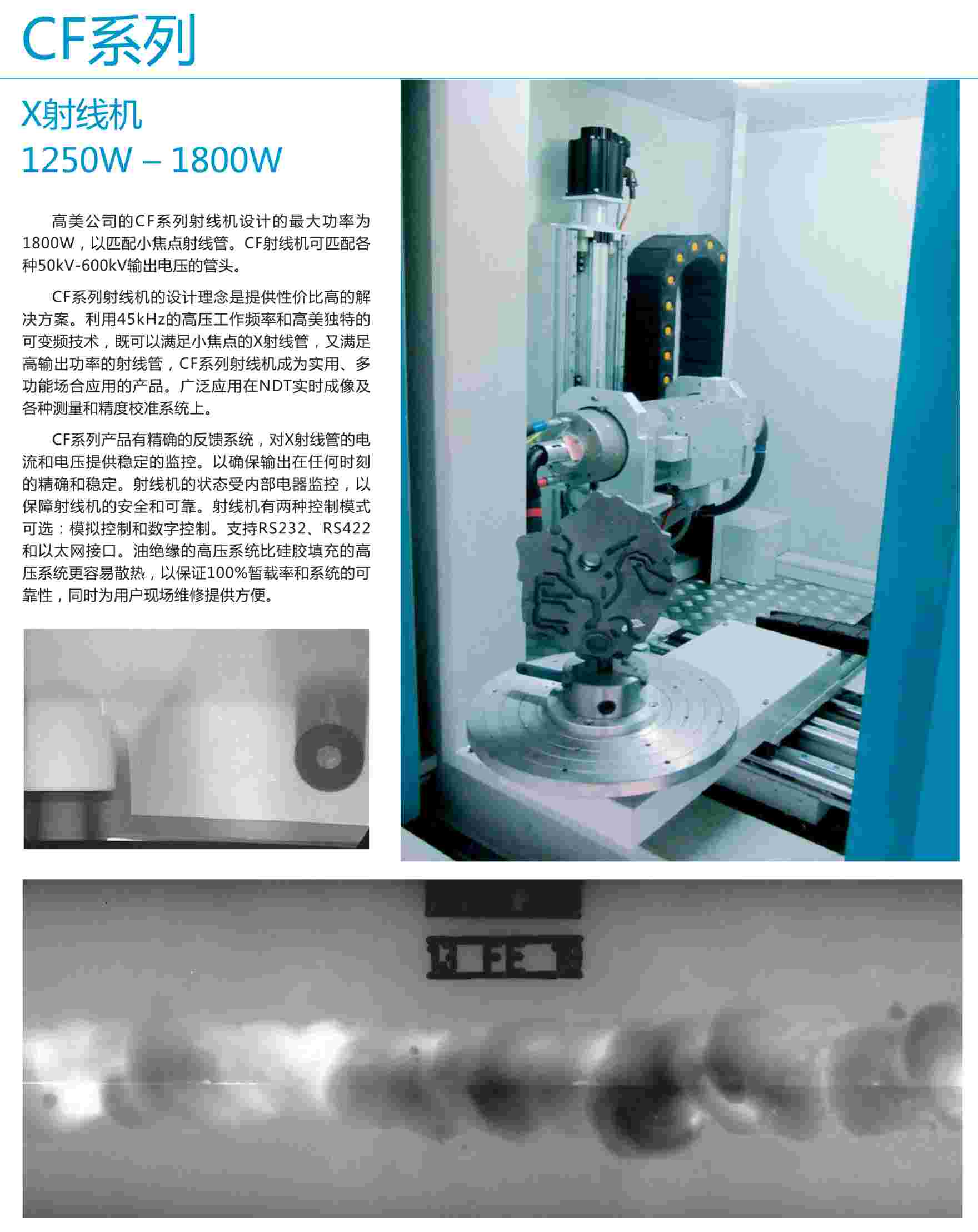 高美公司的CF系列射線機(jī)設(shè)計的最大功率為1800W,以匹配小焦點(diǎn)射線管。CF射線機(jī)可匹配各種50kv-600kv輸出電壓的管頭。