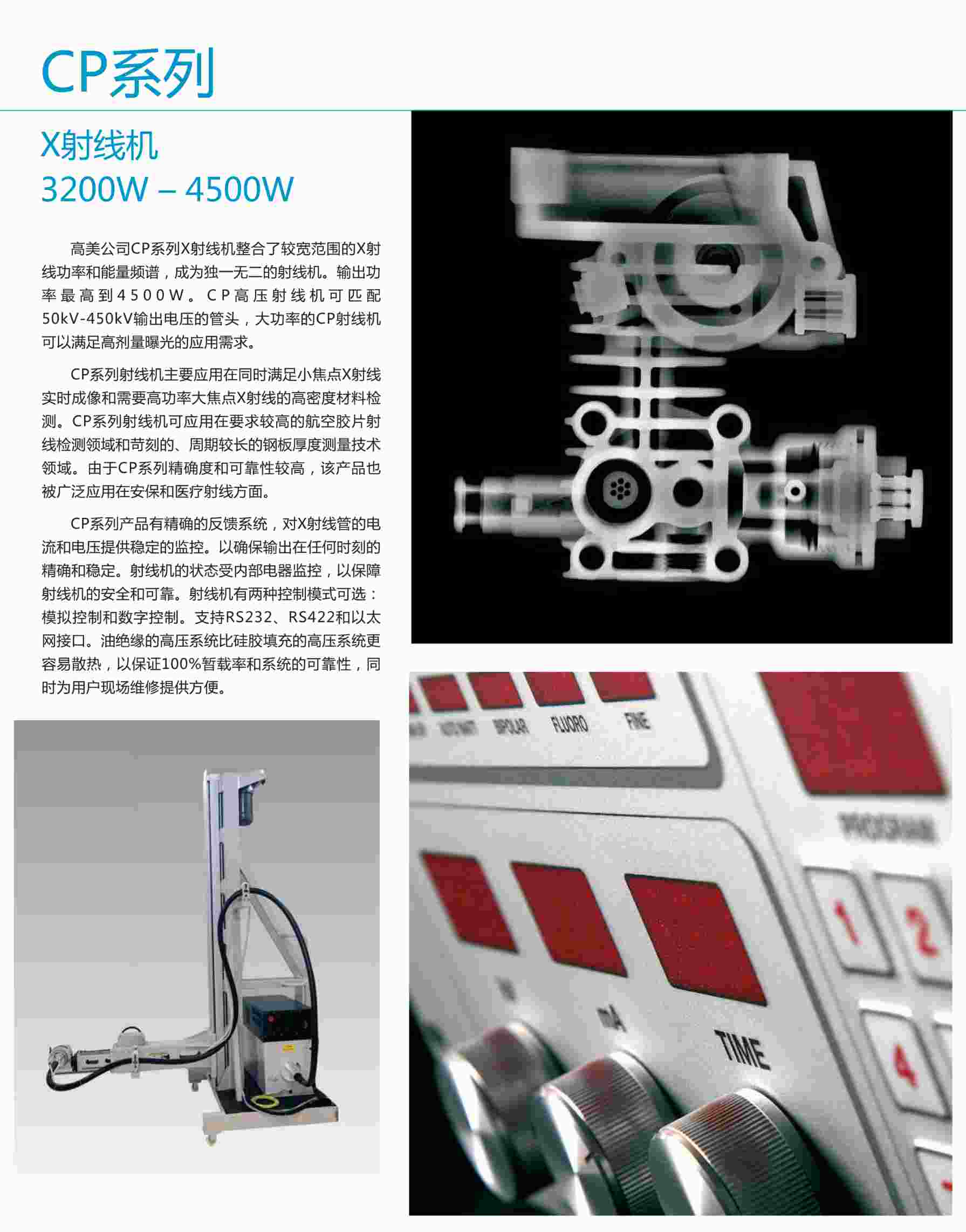 高美公司的CP系列射線機整合了較寬范圍的X射線功率和能量頻譜,成為特有的射線機。輸出功率最高到4500W。CP高壓射線機可匹配50kv-450kv輸出電壓的管頭,大功率的CP射線機可以滿足高劑量曝光的應(yīng)用需求。