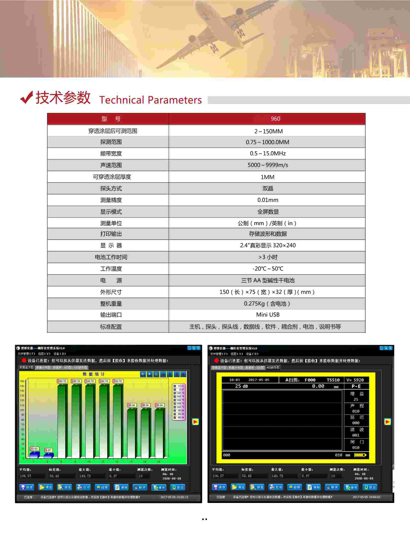 ● 專業(yè)的數(shù)據(jù)處理軟件,基于Windows的Uee?960接口程序用于收集、創(chuàng)建、打印及管理來(lái)自Uee?960測(cè)厚儀的數(shù)據(jù)。顯示數(shù)據(jù)集和測(cè)量總結(jié)文件,文件包含厚度讀數(shù)、測(cè)厚儀設(shè)置值及探頭設(shè)置值,AScan波形和BScan圖形。
