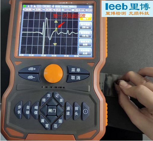 圖1和圖2為無缺陷處的底面回波,其中圖1中紅箭頭標(biāo)注的為高頻探頭延遲塊的界面回波,顯示深度為33.35mm,圖2中紅箭頭標(biāo)注的為鋼板第一次底面回波,顯示深度為34.85mm,即為鋼板厚度為34.85-33.35=1.5mm,通過這方法來判斷底面回波。