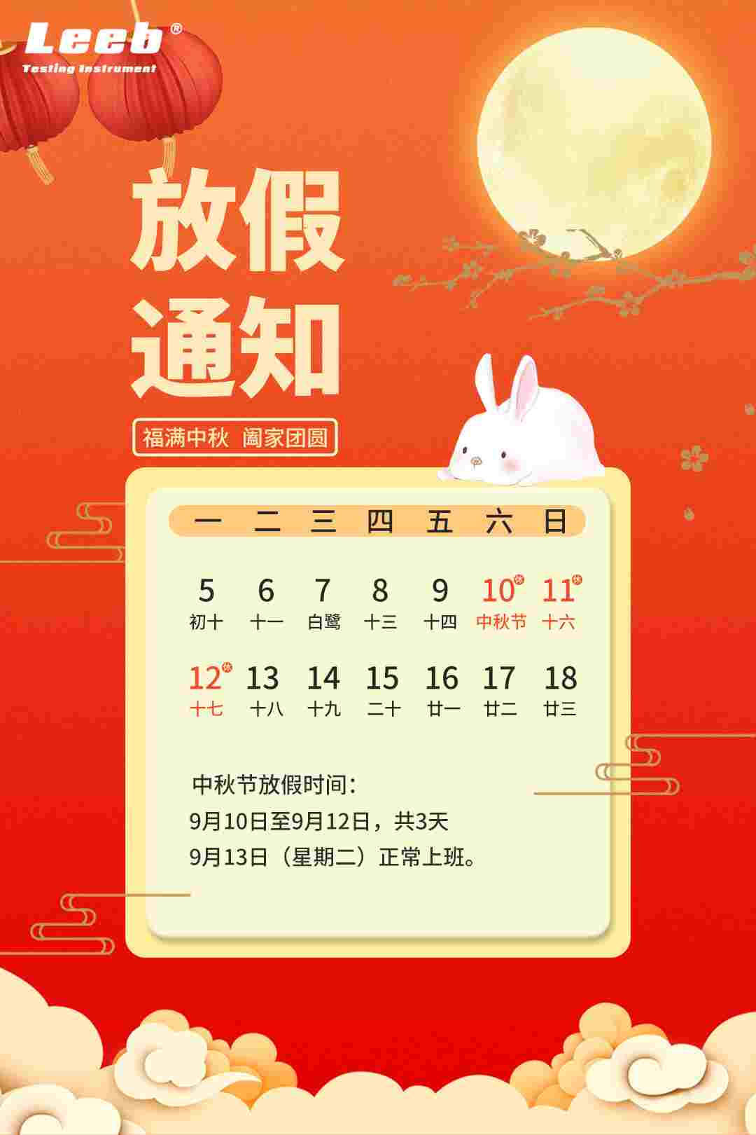 中秋節(jié)放假時(shí)間:9月10日至9月12日,共3天。9月13日(星期二)正常上班。放假期間,公司正常接單,在9月13號(hào)陸續(xù)發(fā)貨。