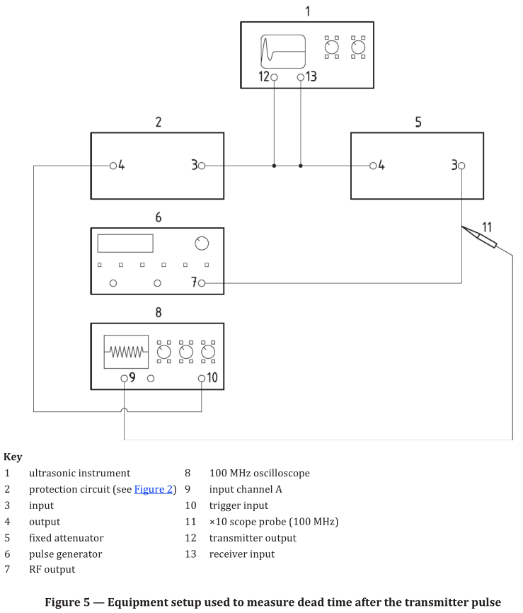 見EN12668.1:2010和ISO22232-1-2020中的相應(yīng)部分,得出的是時間,一般要求是不大于10μs。ISO22232-1-2020規(guī)定的測試示意圖如下: