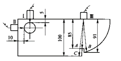 通用原理就是探測不同深度的反射體,找到最近的那個反射體,要求該反射體的回波能和始脈沖獨立識別,這個最近的距離就是盲區(qū)。得出的距離。通常利用CSK-1A試塊上Φ50有機玻璃圓弧面距兩側(cè)邊緣5mm和10mm的邊距來測盲區(qū)大小,若探頭置于I處有獨立回波則盲區(qū)小于等于5mm。若I處無獨立回波,II處有獨立回波,則盲區(qū)在5~10mm之間。若II處仍無獨立回波,則盲區(qū)大于10mm。(此處的“獨立”意思是回波高度超過滿屏50%以上時,且回波前沿和始波后沿相交的波谷滿足低于10%滿刻度)盲區(qū)的測試還可以用DZ-I試塊進行,測試原理相同。