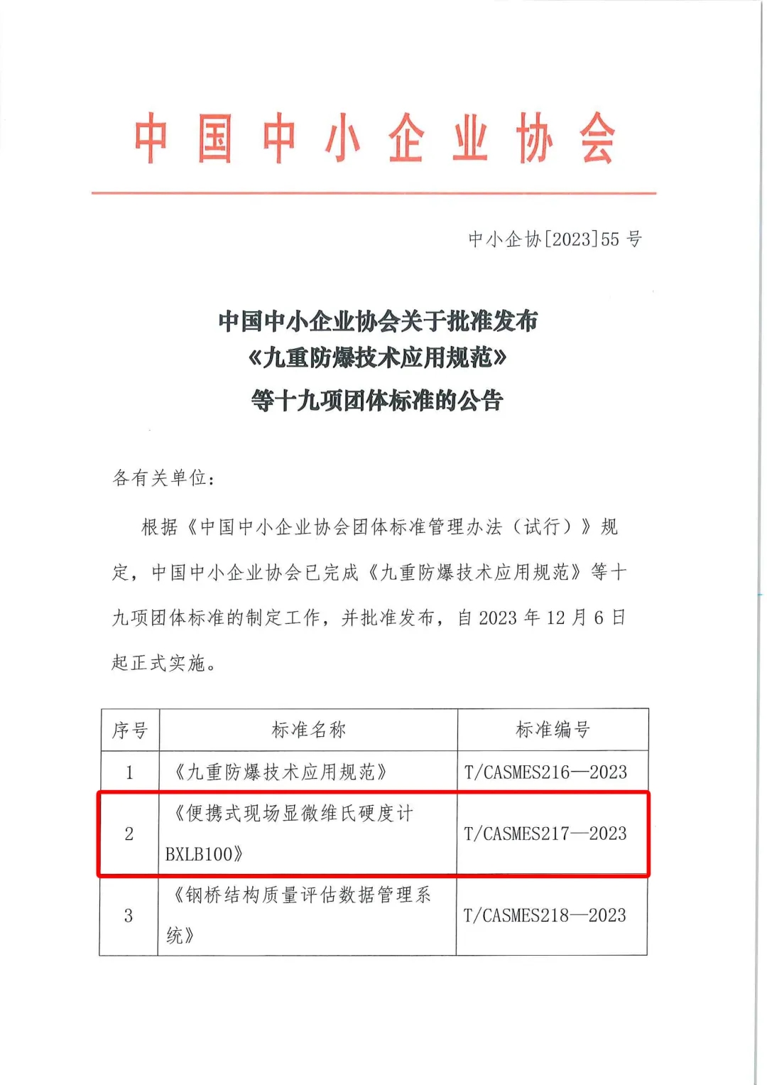 2023年12月6日,由我公司里博儀器牽頭制定的《便攜式現(xiàn)場(chǎng)顯微維氏硬度計(jì)BXLB100:T/CASMES217-2023》團(tuán)體標(biāo)準(zhǔn)正式發(fā)布并實(shí)施,該項(xiàng)標(biāo)準(zhǔn)是我公司發(fā)布的首項(xiàng)全國(guó)性團(tuán)體標(biāo)準(zhǔn)。